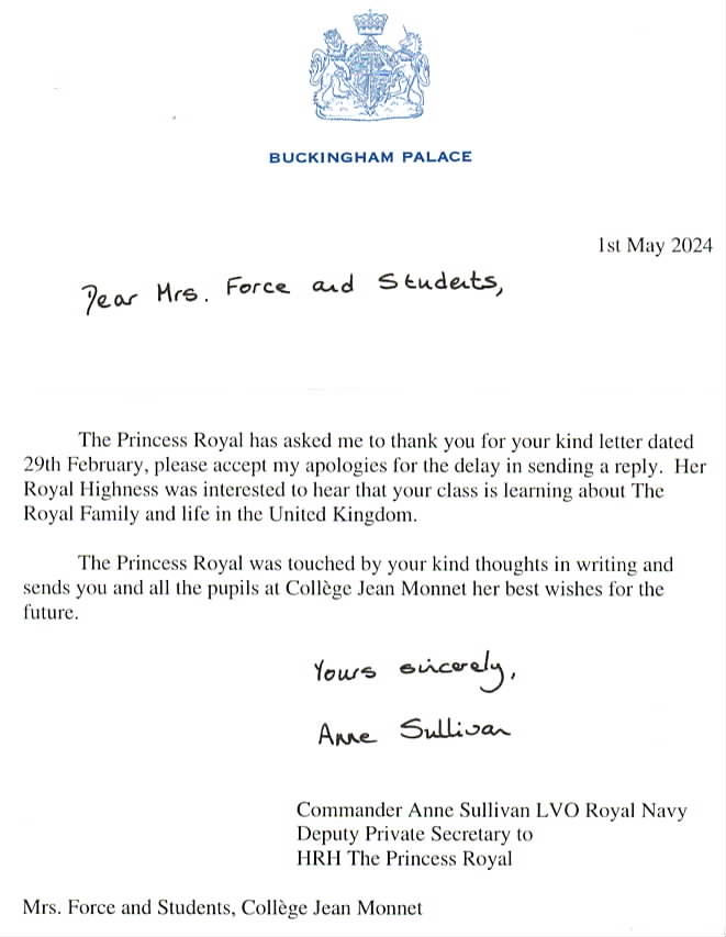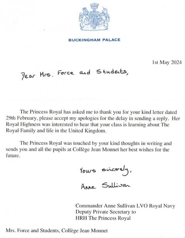 A l’occasion d’un mini-projet autour de la famille royale britannique et du Royaume-Uni, les élèves des classes de 5ème 3 et 4 ont rédigé en groupes plusieurs courriers à l’attention de différents membres de la famille royale.